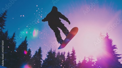 Snowboarder mid-jump off a snowy ramp, dynamic motion and vibrant gear contrasting against a clear blue sky