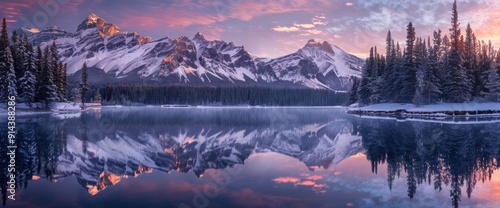 Snow-Capped Mountains Reflected in a Serene Lake at Dawn
