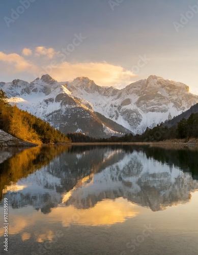 Snow-capped peaks reflected in a tranquil alpine lake during winter