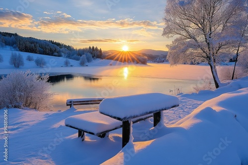 Snow-Covered Bench by a Frozen Lake at Sunset