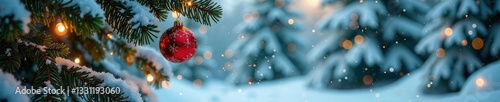 Snow-covered fir branches with sparkling ornaments, delicate ornaments, sparkly, frozen