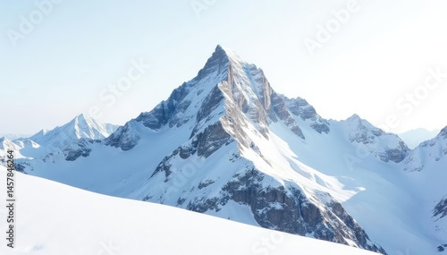 Snow-covered mountain peak, pristine white background, travel, calm, nature