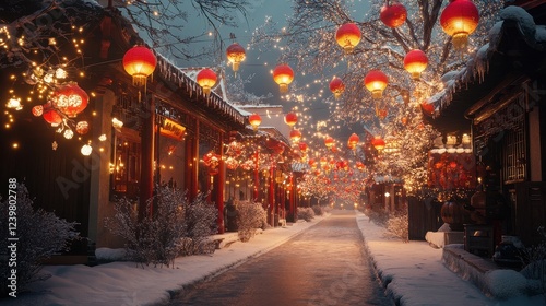 Snow-covered street with red lanterns & warm lights adorning traditional Chinese buildings. Perfect for winter holiday, Asian culture, or festive themes.