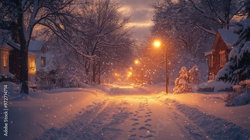 Snow-covered suburban street with bare trees, warm glowing streetlights, and footprints in the fresh snow. 4K hyperrealistic photo.