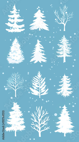 Snow-Covered Tree Icons Set, Winter Forest Elements