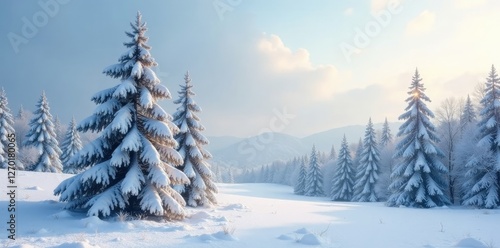 Snow-covered trees swaying gently in morning breeze, frozen, trees