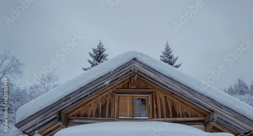Snow-Covered Wooden Cabin Gable, Winter Wonderland Retreat