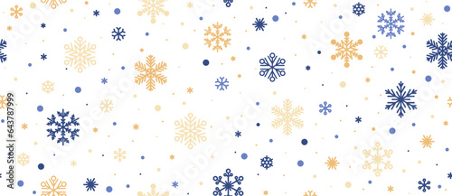Snowflake pattern. Seamless Christmas gold blue white background.