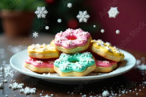 Snowflakes falling gently on a plate of colorful cookies, cookie plate, cookies