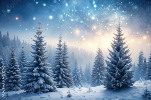 Snowflakes gently falling isolated conifers frozen winter landscape misty soft focus dreamy ethereal peaceful serene natural beauty