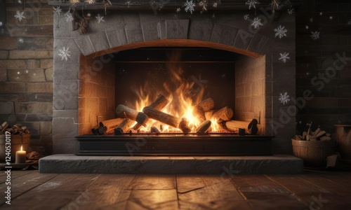 Snowflakes gently falling on a roaring fireplace, cozy cabin, winter magic, warm glow
