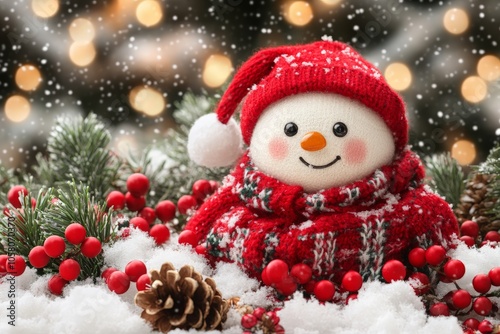 Snowman in a cozy red scarf nestled in fresh snow among holiday ornaments capturing a warm and joyful winter scene filled with festive cheer and seasonal charm