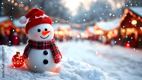 Snowman with a red hat and scarf stands in a winter market during the holiday season with bright lights in the background