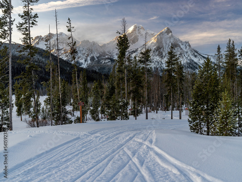 Snowmobile tracks on a road leading to the Sawtooth mountains