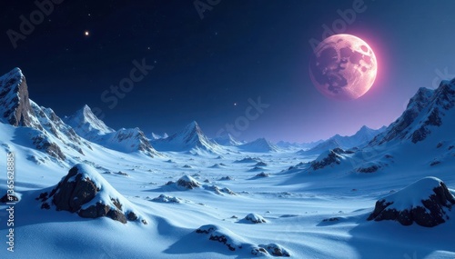 Snowy asteroid landscape with frozen craters and glowing ice caps , starry night, galaxy
