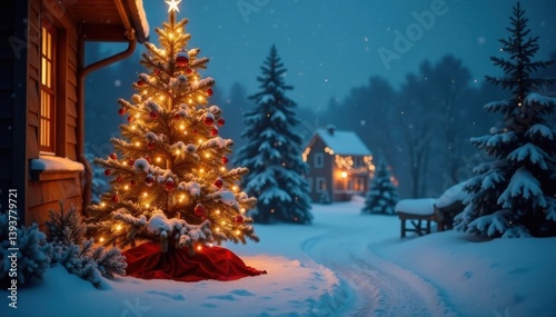 Snowy Christmas Eve scene with decorated tree and festive lights, snowy scene, christmas eve