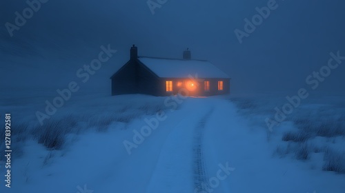 Snowy Evening Cottage: Warm Light Emanates from Windows in a Cold Landscape