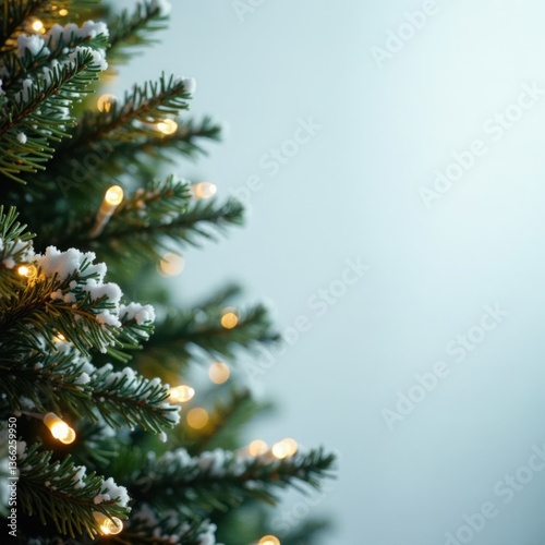 Snowy evergreen branch garland wrapped around Christmas tree, lights shining through , christmas, branches
