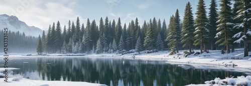 Snowy forest landscape with a frozen lake and evergreen trees, serene, nature