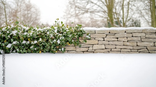 Snowy Landscape with Stone Wall and Greenery