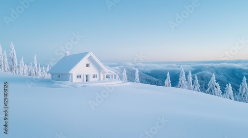 Snowy mountain cabin at dawn; tranquil winter landscape; scenic view; perfect for winter getaways