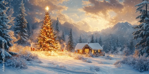 Snowy mountain Christmas scene; cabin, tree. Holiday card