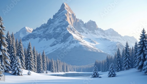 Snowy mountain landscape with a serene lake and evergreen trees.