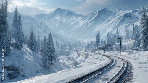 Snowy Train Tracks Through Mountain Forest In Winter