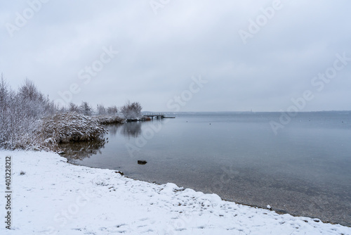 Snowy winter landscape at the Cospudener Lake in Leipzig