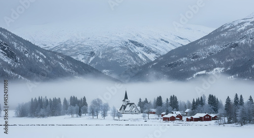 Snowy Winter Landscape with Church and Red Cabins Amid Mountains
