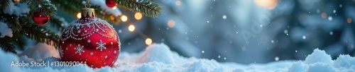 Snowy winter scene with a large Christmas ball suspended in air, festive, ball, ornament