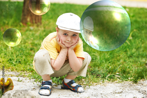 Soap bubble. The boy on a nature