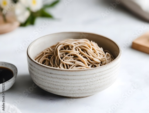 Soba, Japanese noodle made of buckwheat flour, served either cold or hot in a noodle soup.