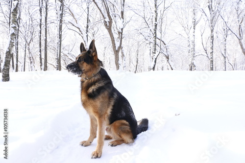 Собака немецкая овчарка сидит на снегу зимним днем