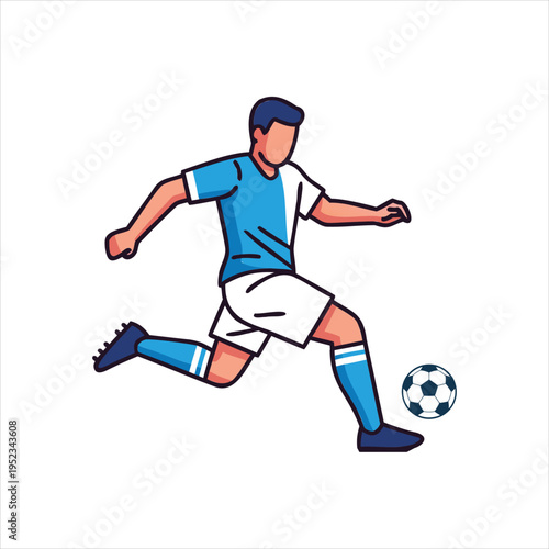 Soccer Player Cartoon Vector – Dynamic Kicking Ball Pose Blue White Uniform Sports Art