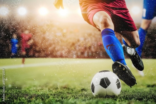 Soccer Player Kicking Ball for Winning Goal at Stadium, Close Up Shot.