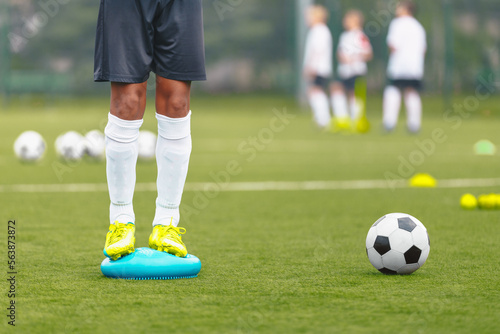 Soccer Player Standing on Stability Cushion on Grass Field and Improving Body Balance. Football Player Improving Skills With Personal Trainer. Football Equipment for Youth Players