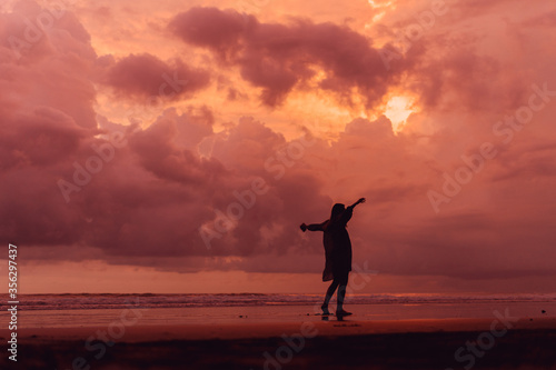 social distancing on the beach , pink and orange amazing cloudy sky , beautiful sunset , Bali Indonesia , solo outdoor walking