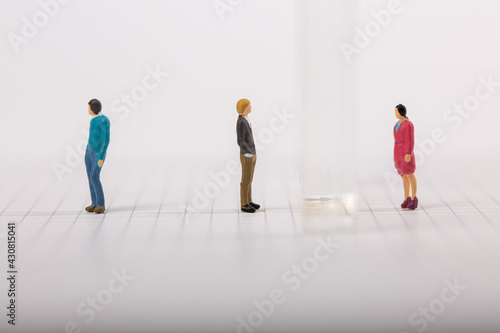 Social distancing, people keeping distance to protect COVID-19 coronavirus outbreak spreading concept, miniature keep distance each other using plexiglass.