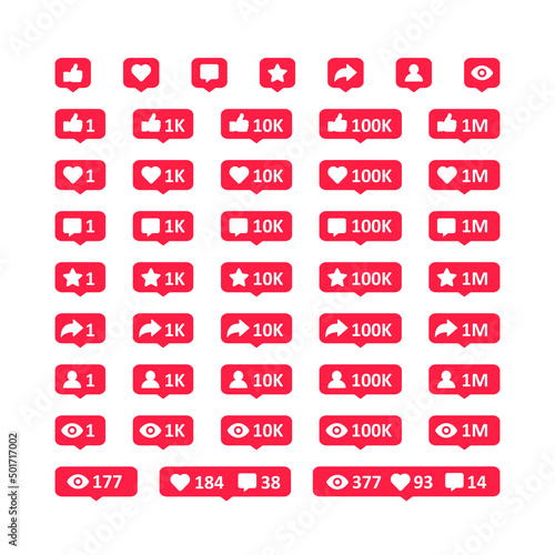 Social media activities notification vector icons set. Thumbs up, like, comment, favorite, share, followers, views sign symbol. Vector illustration EPS 10