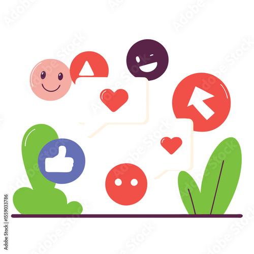 Social media icons and feedback elements with playful characters and plants