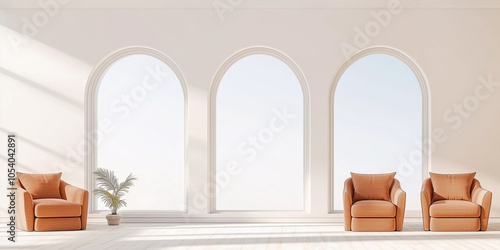 Sofa, Terrakotta-Sessel vor Bogenfenstern. Minimalistisches Innendesign eines modernen Wohnzimmers.