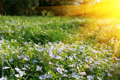 Soft focus carpet of Nemophila (baby blue eyes) flower with sunlight rays. Spring background. Copy space