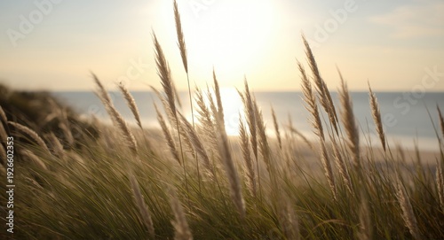 Soft focus on dune grass and reeds with a glowing ocean and bright sky