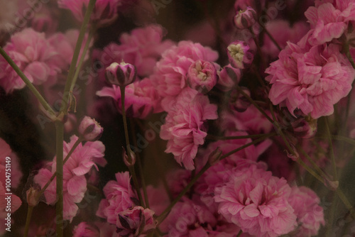 Soft focus smoke pink flower bouquet through fluted matte frosted glass. Abstract Nature blur dark background.