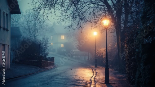 Soft Glow of Streetlamps Illuminating a Foggy Quiet Street Scene