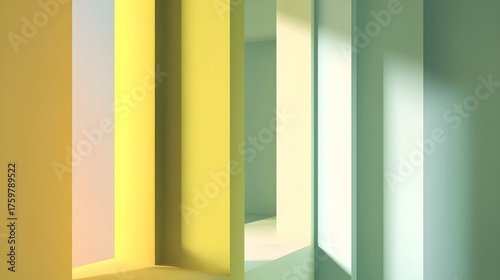 Soft light streams through colorful geometric architectural forms.