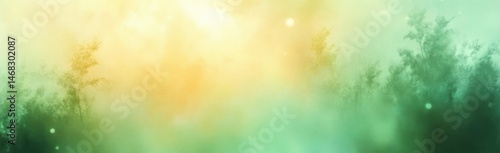 Soft misty forest landscape with blurred green and yellow hues evoking a calm and ethereal atmosphere