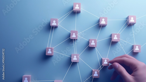 Soft pastel background in shades of lavender and sky blue, with wooden blocks and people icons linked by gentle lines, illustrating the concept of social media networking in busine