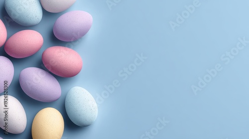 Soft pastel Easter eggs arranged on a light blue background for a festive spring celebration